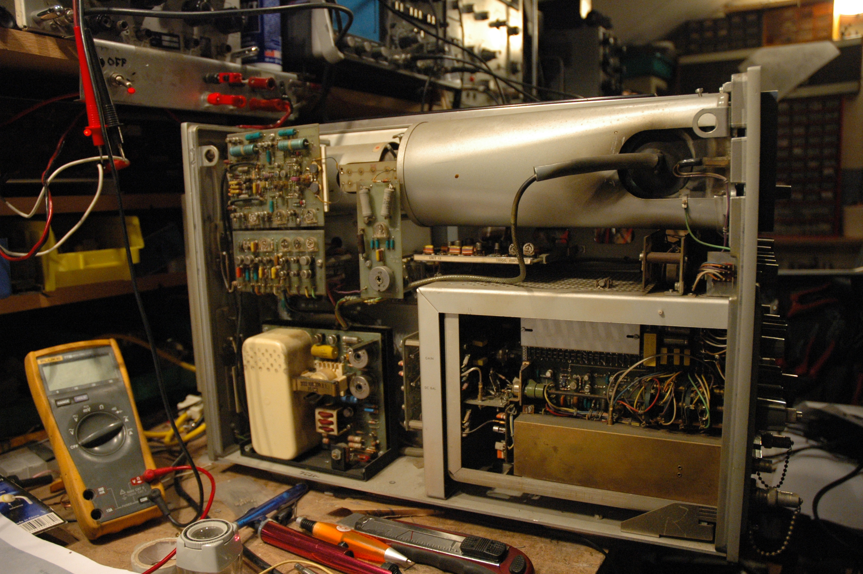 Gisteren de nieuwe voeding aangesloten., Klapte er 3x achter elkaar de diodes uit van de -24V. Tot ik er achter kwam dat dat gebeurden zodra ik het koelblok in de kast legde en dat dus aarde maakt. Wel vreemd want de regelaars zijn geïsoleerd gemonteerd. Maar eerst eens zien of ik beeld krijg. De +24 is een vaste regelaar en die geeft dus meer dan 25V, misschien een dikkere elco. -24V zakt in tot -23 dus die -6,3V op de zelfde wikkeling is blijkbaar niet zo'n goed idee of er moet een tor overheen omdat de regelaar begrenst. Kortom ik ben er nog lang niet. Wat een gedoe. Volgens mij is het haast makkelijker om mijn 6MHz buizen scoop op 100MHz te laten draaien dan deze te repareren. By the way, het is als grap bedoeld maar waarom kan deze scoop tot 150MHz, mijn philips maar tot 10MHz en die buizen tot 6. Wat is het frequentie bepalende onderdeel ? De beeldbuis, ? want dan weet ik nog een leuk project: die buizenscoop uitrusten met de beeldbuis van de 3370. :twisted: