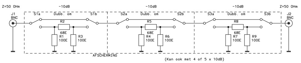 Er worden dubbele wisselschakelaars ("dubbel-om") gebruikt. Niet optimaal voor 50 Ohm, maar het is maar voor kleine signaaltjes of ontvangst. In stand "off" wordt er gewoon een doorverbinding gemaakt en wordt het weerstandsnetwerk gepasseerd. In stand "on" wordt het weerstandsnetwerk ingevoegd. Per schakelaar zijn dat drie weerstanden en met deze waarden (68 en 100 Ohm) levert dat een deming op van ca. 10dB. Dat kun je herhalen met nóg zo'n schakelaar en netwerkje. Je kunt dan 20dB demping verzorgen. Etc. voor 30, 40 of 50dB. Ik ben doorgegaan tot 5 schakelingen. Belangrijk is, dat de schakelingen elkaar onderling niet "zien". Je zult dus moeten gaan werken met schotjes ter afscherming. De massa moet zeer goed zijn en geschikt voor RF signalen.