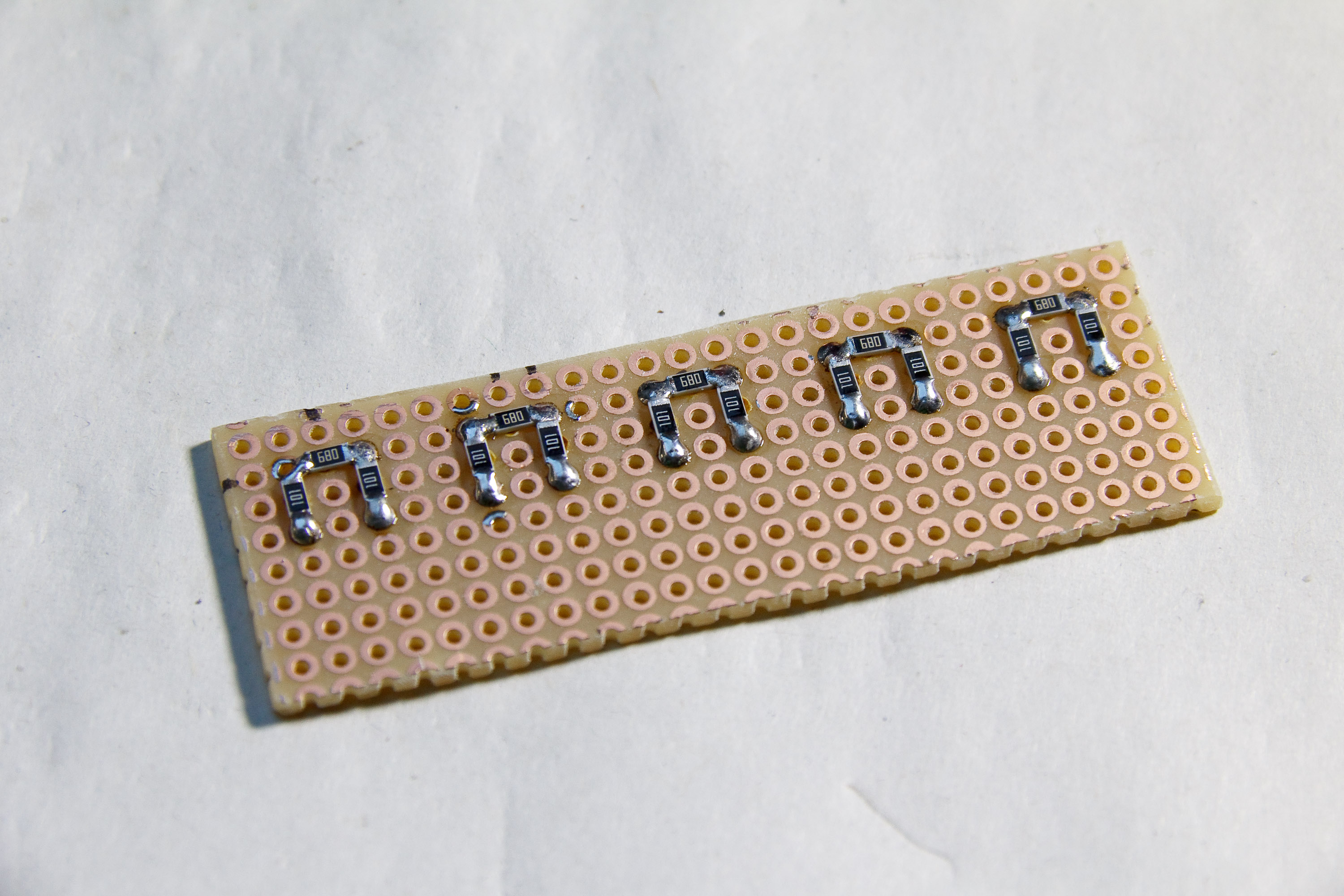 Ik ben begonnen met wat meten en ontdekte dat met wat experimenteerprint precies de juiste afstand was te maken tussen de netwerkjes, zodanig dat ook nog de schakelaars naast elkaar pasten. Tussen de schakelaars bleef slechts een kier over van nog geen millimeter. De eilandjes onder de SMD weerstanden zijn verwijderd; de weerstandjes zijn klein en kortsluiting is zo gemaakt. Ook wilde ik capacitaire koppeling minimaliseren.