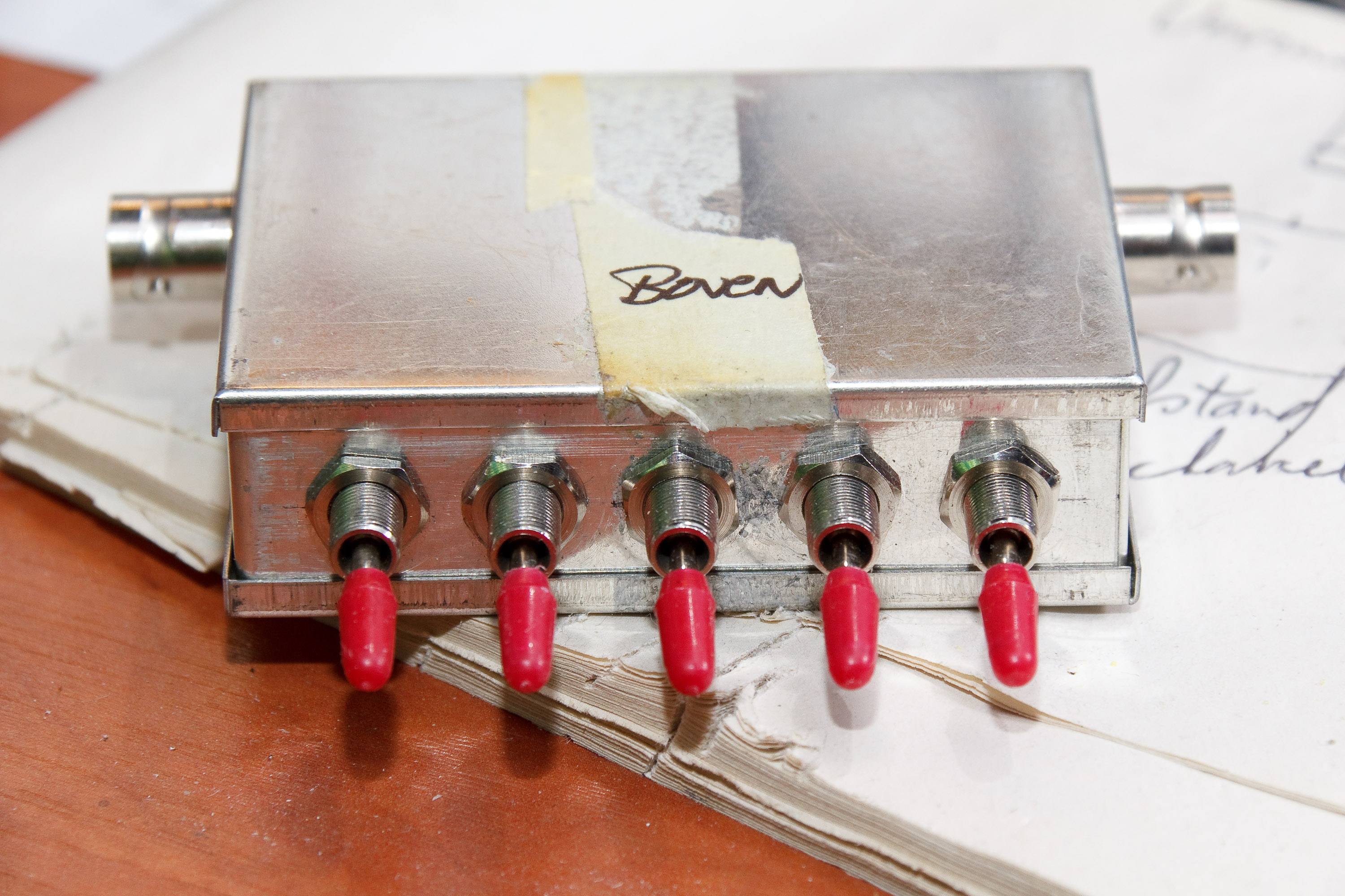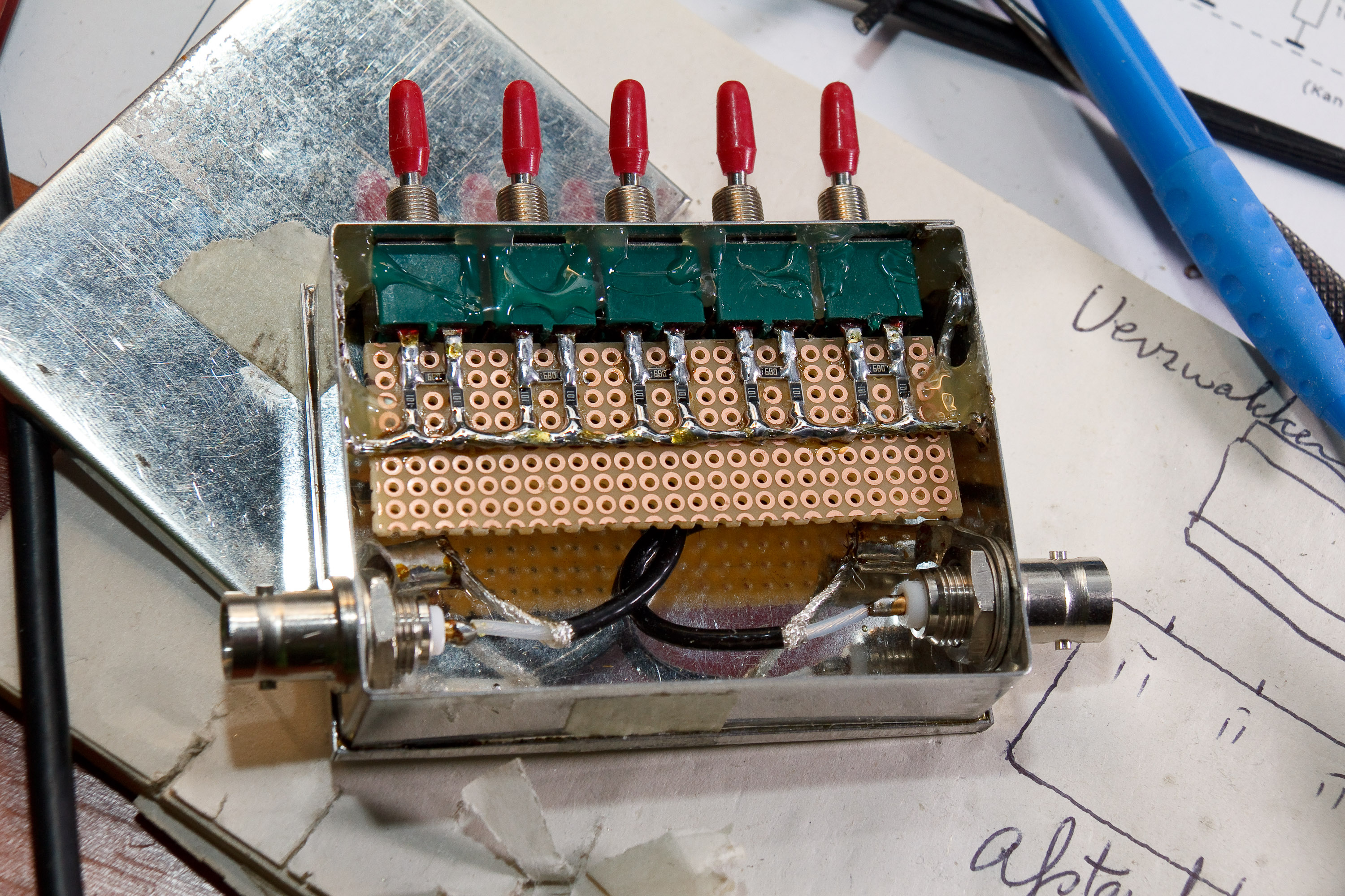 Vervolgens kon de print op de schakelaars gesoldeerd worden en konden de coax kabeltjes gesoldeerd worden aan de BNC chassisdelen (later heb ik de coax kabeltjes nog ingekort en minder ver afgestript):