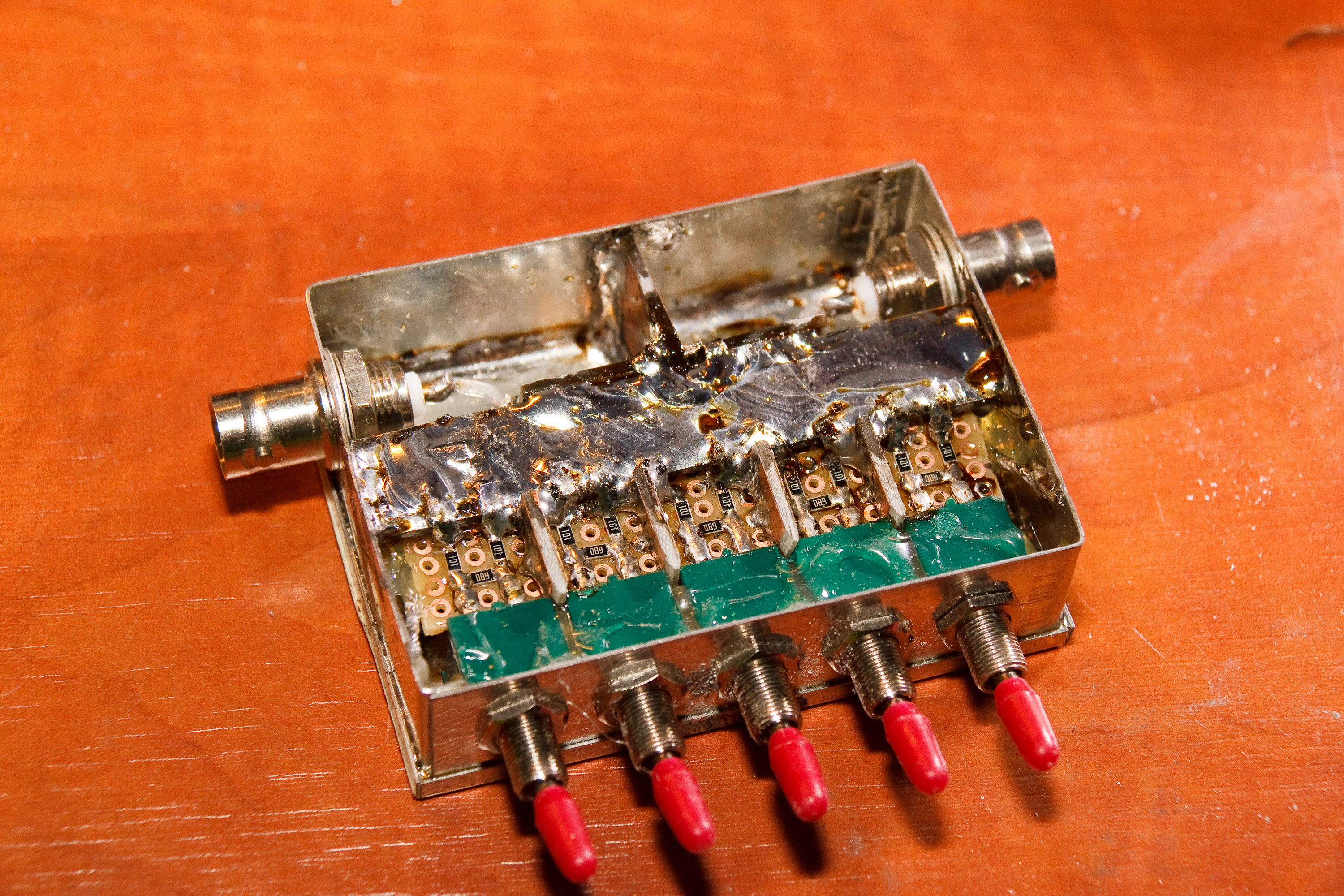 Bovenstaand voorbeeld was niet voldoende (ging goed tot 20dB en niet meer). Het moet veel demping opvangen, dus werk met een plaat (stuk koper printplaat ofzo). Dit draadje werkt bovendien als een soort spoel. Ook missen de schotjes tussen de weerstandsnetwerkjes nog. Maar gelukkig had ik ruimte overgelaten: