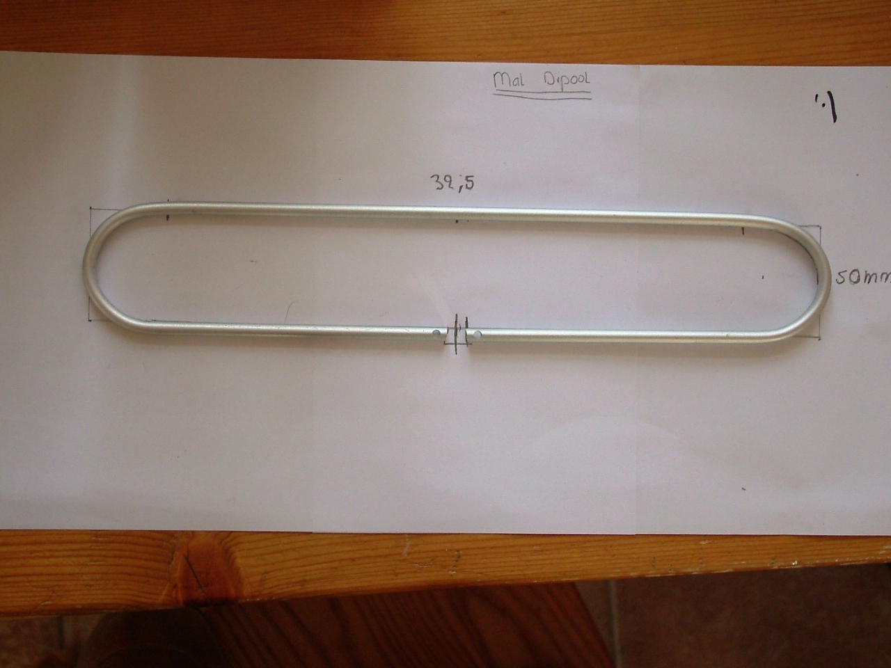 Bij een landelijk bouwmarkt heb ik 6 mm aluminium buisjes gehaald, bij een plaatselijke alles-verkoper een buigijzer gekocht; ik kon oefenen. En oefenen moest ik wel, wat komt dat precies, voor je het weet is je dipool helemaal uitgerekt en klopt er van de maten niks meer!