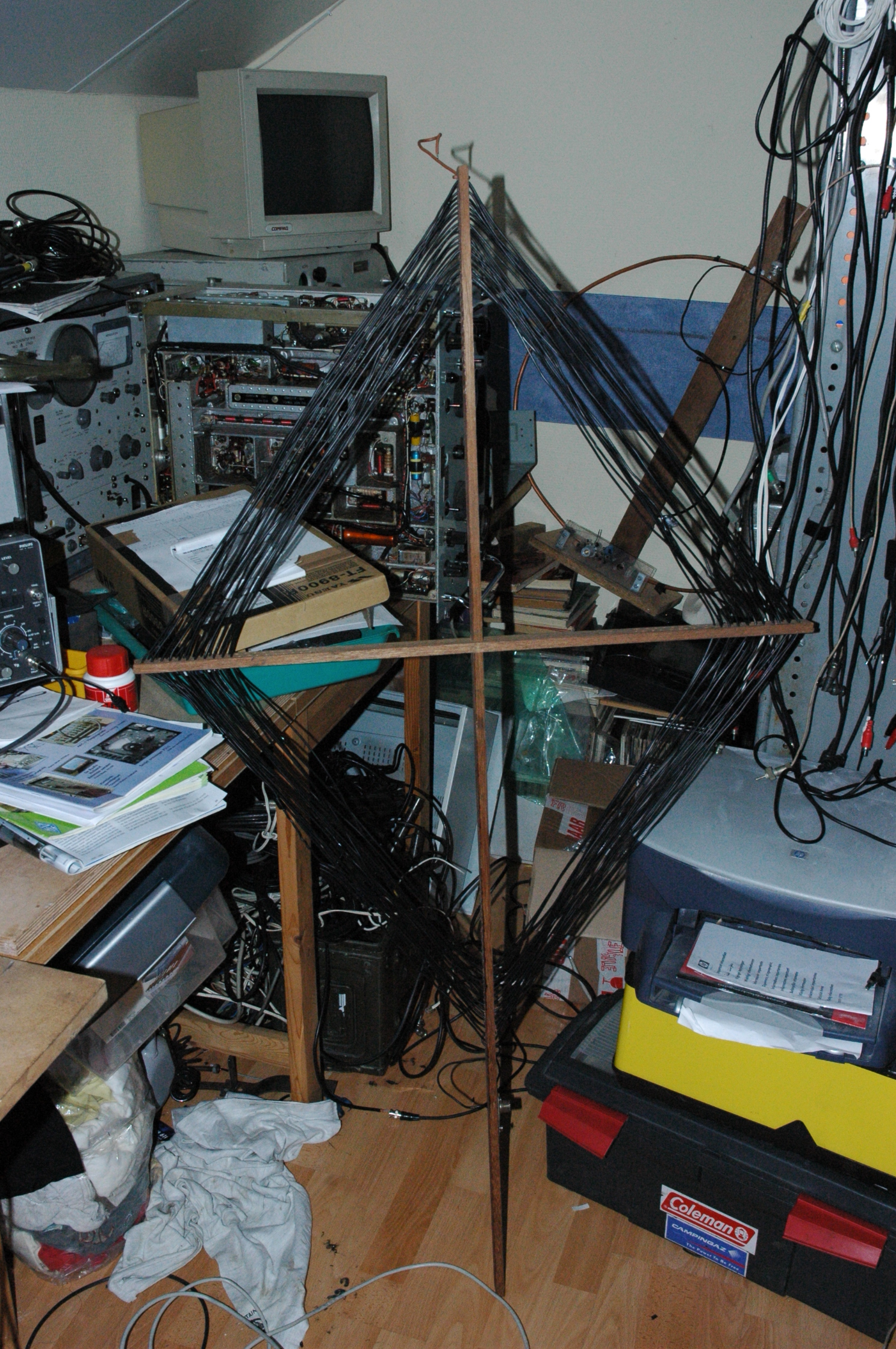 De antennes: een aperiodisch raam. Een houten kruis waar 20 windingen draad opligt. Totaal 50m installatie draad. De "QRM sniffer" antenne, een vertikaal telescoop sprietje uit een oude radio.