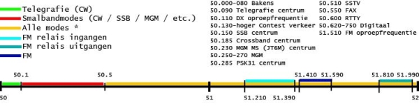 Tussen 50.000 en 50.450 is max. 120 Watt toegestaan voor klasse A1A (CW) en J3E (SSB). Voor de rest van de band en alle andere klassen is max. 30 Watt toegestaan.
